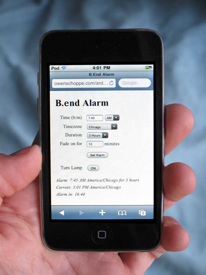 B.end Light is an internet enabled alarm clock that triggers a light in the bedroom, encouraging a natural wake cycle. As part of a series of prototypes exploring different manifestations of the "Internet of things", B.end controls the lamp with an Arduino. The latest functional prototype utilizes a web form, accessible from a mobile device, to control the alarm. This has allowed me to prototype a variety of interfaces and experience life with networked furniture.