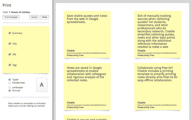 Collaborate using Post-its? Citable includes a printing template to simplify printing notes directly onto Post-its for easy offline collaboration.